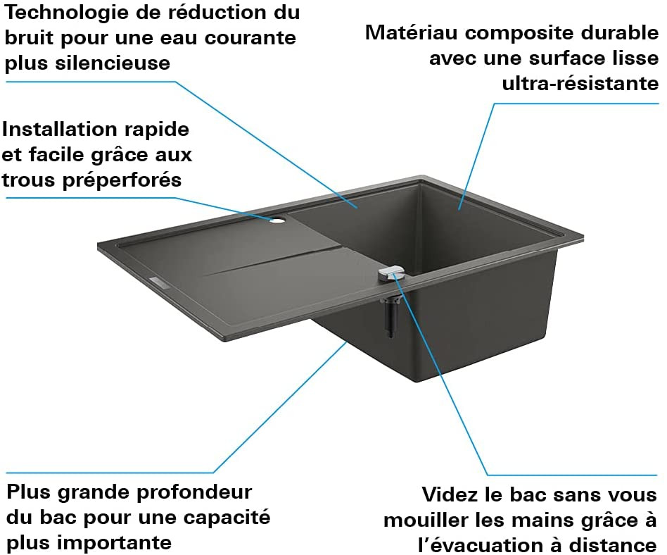 Caractéristiques de l'Evier en quartz composite avec égouttoir réversible 780x500 mm, Gris granite, Grohe K400 (31639AT0) :