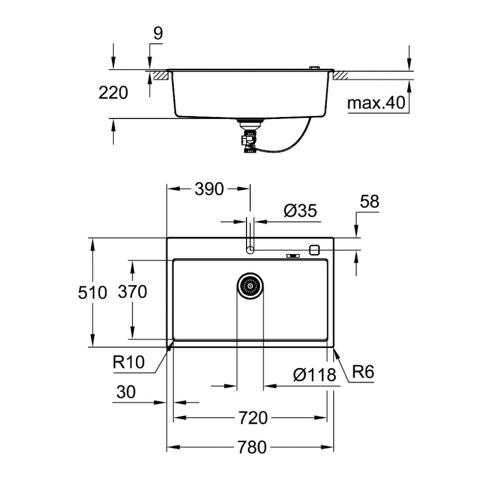K700 Evier Composite sous-plan, 780 x 510 mm + Vidage, Siphon, Bonde inclus, Noir Granite (31652AP0)