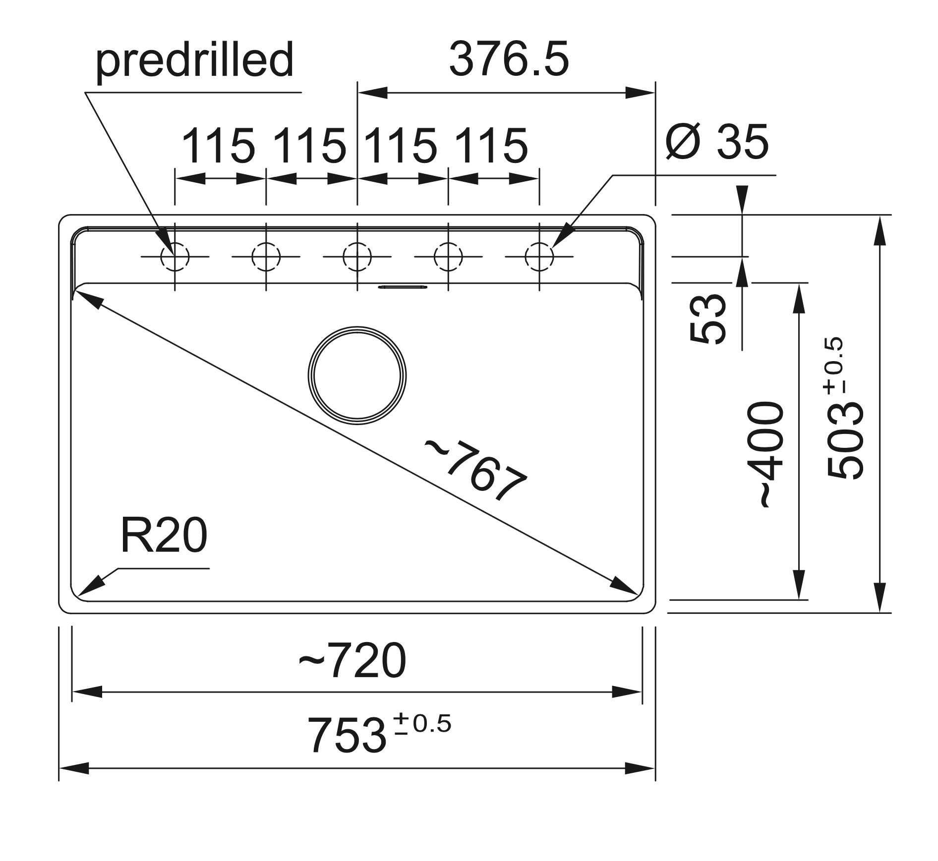 - Taille de l'évier : 753 x 503 mm