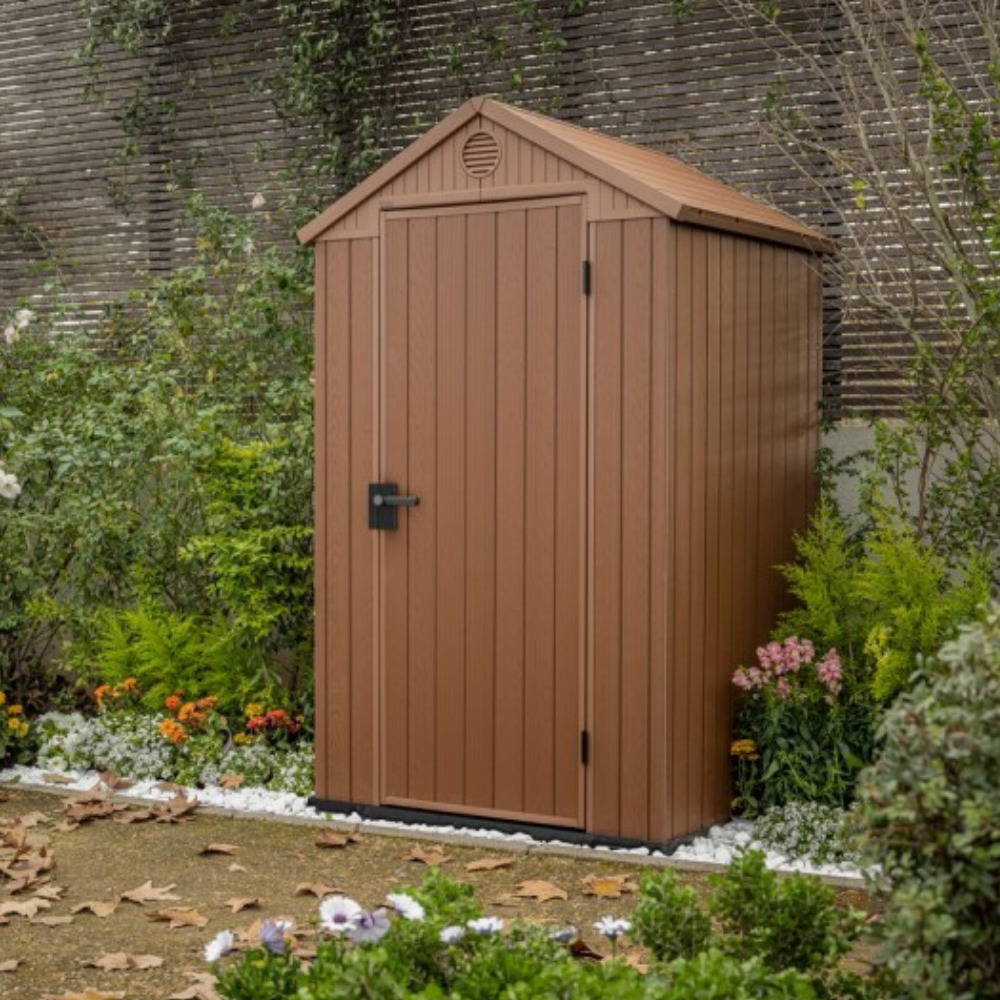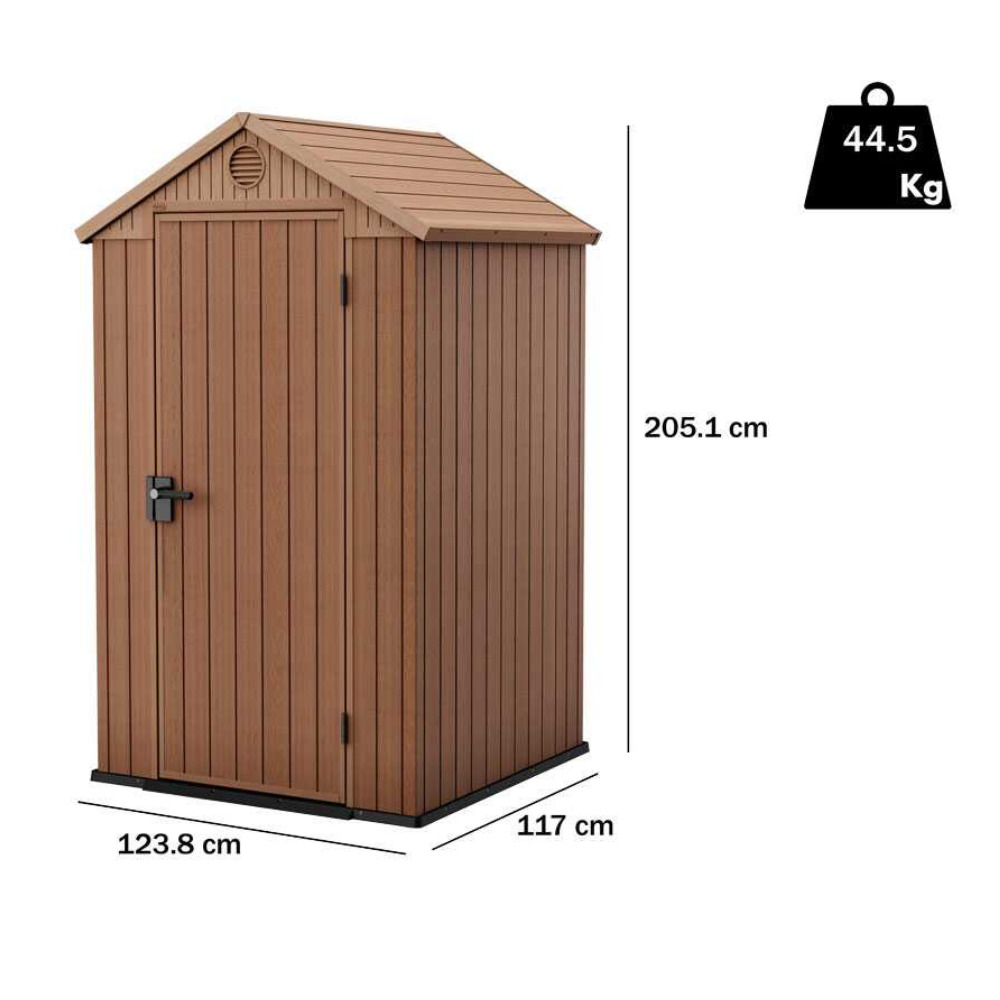 Abri de jardin Keter Darwin 123,8 × 117 × 205,1 cm en résine PVC marron, porte simple, toit double pente (259006)