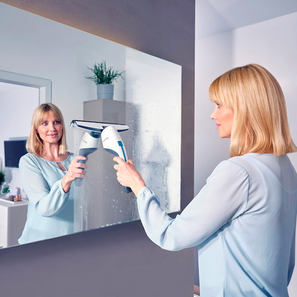 - Une buse spéciale pour salle de bains équipée d’une raclette blanche pour le nettoyage hygiénique des miroirs, des carreaux ou de la cabine de douche est disponible séparément