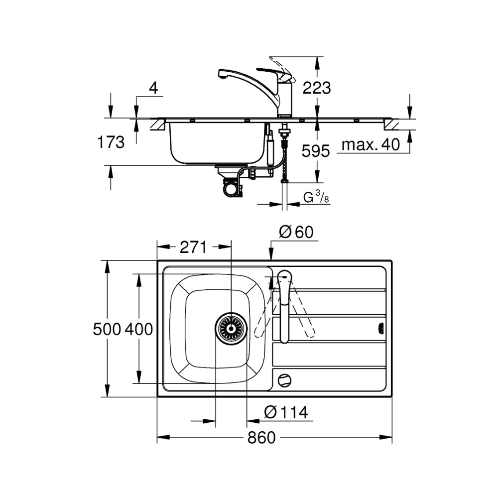 Caractéristiques du set évier à encastrer + mitigeur cuisine, Grohe Eurosmart, inox (G31565SD1) :