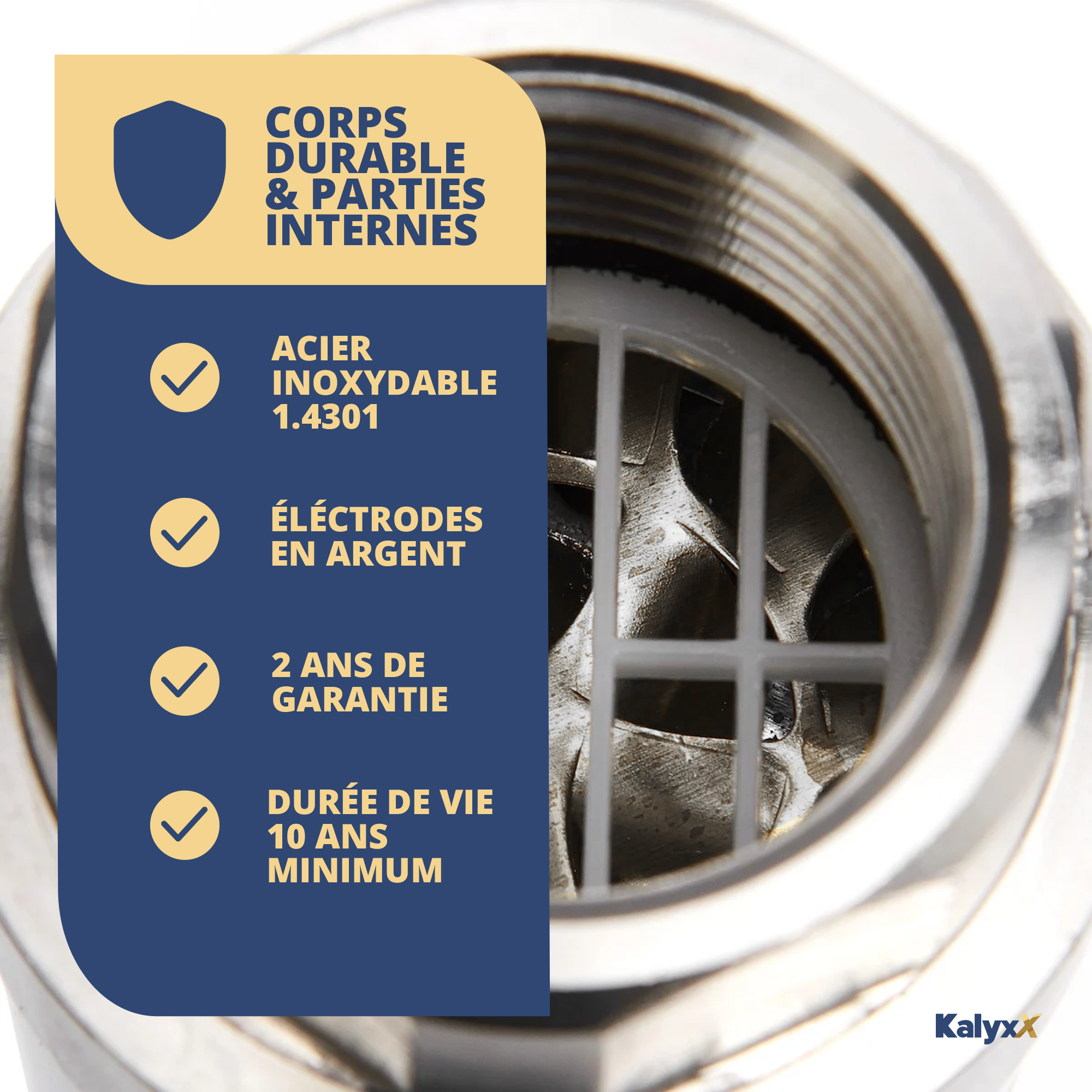 Effet antibactérien : Grâce à des pièces argentées intégrées, le Kalyxx BlueLine empêche la croissance bactérienne, assurant une eau plus pure et plus saine.