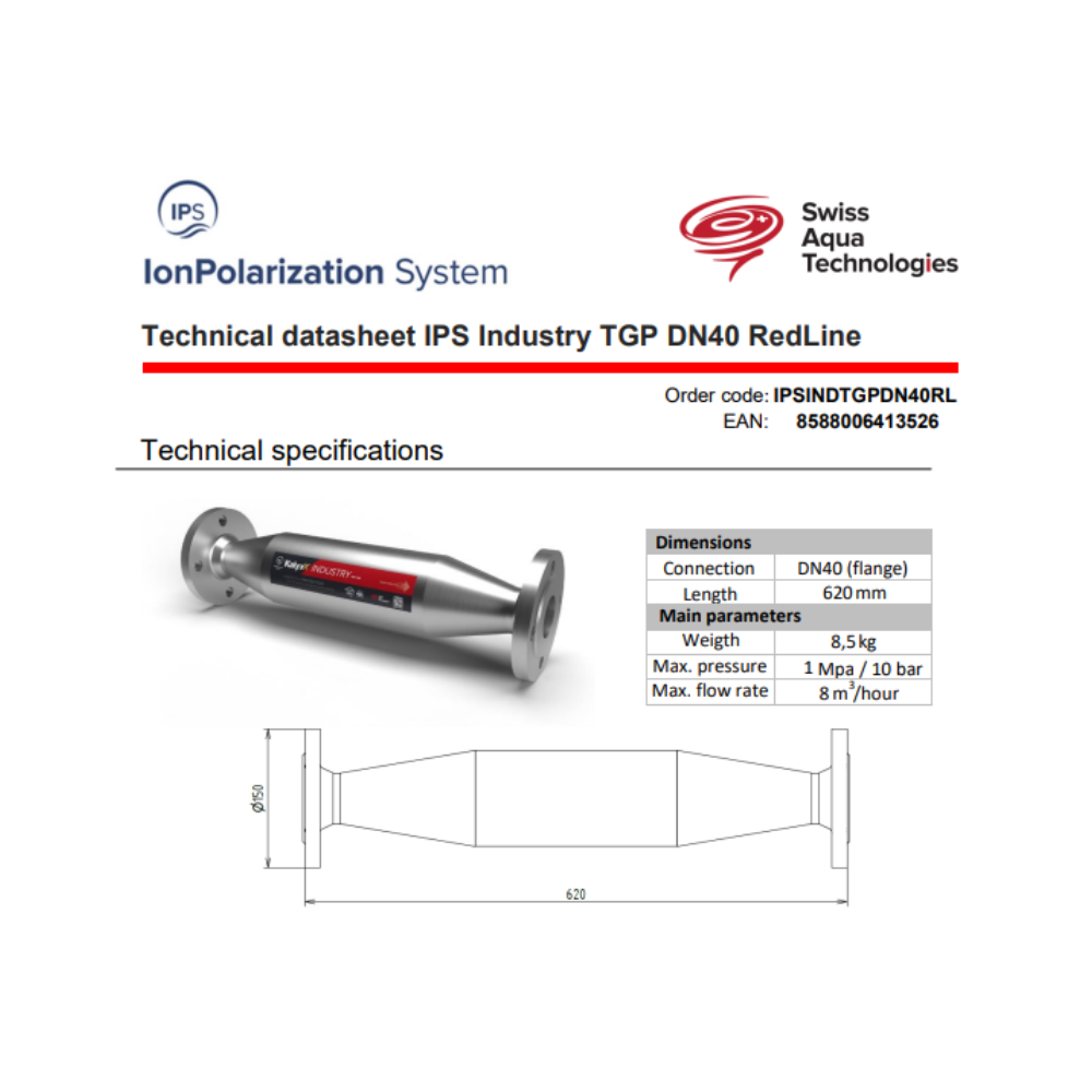 Caractéristiques de l'adoucisseur d'eau Industriel Anticalcaire Antibactérien innovant IPS Kalyxx RedLine DN40 Swiss Aqua Technologies (IPSINRDN40P) :