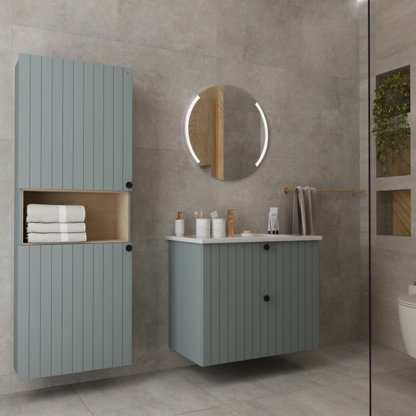 - Beauté mate - le placard suspendu pour accessoires de salle de bain 55x155x25 de couleur vert fjord mat avec poignées noires apporte fraîcheur et propreté à votre salle de bain, créant un espace plein de lumière et d'élégance.
