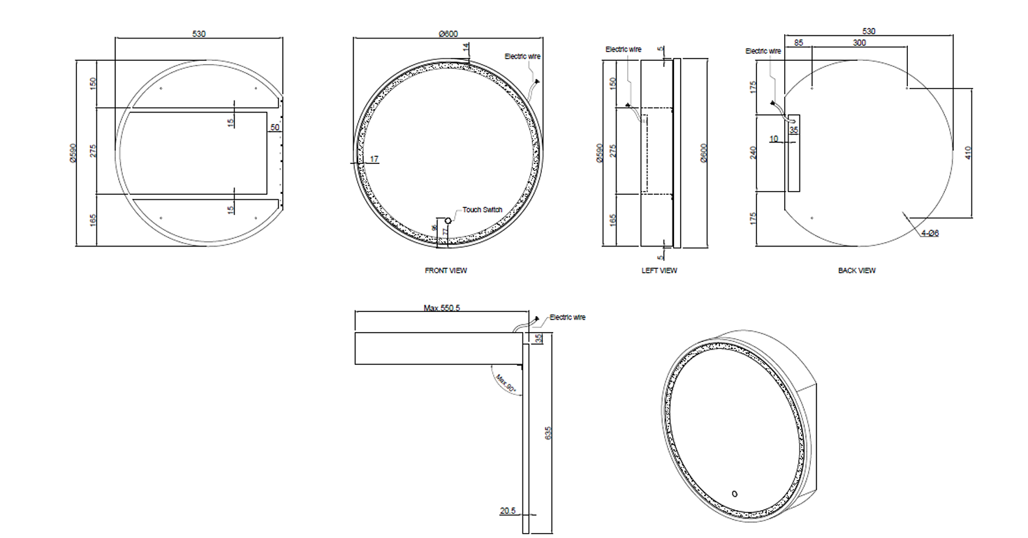 Caractéristiques de l'armoire suspendue de salle de bain ronde 60x60x12,5 cm avec miroir intégré et éclairage, 2 étagères, Swiss Aqua Technologies, noir (SATZGALED60CE) :