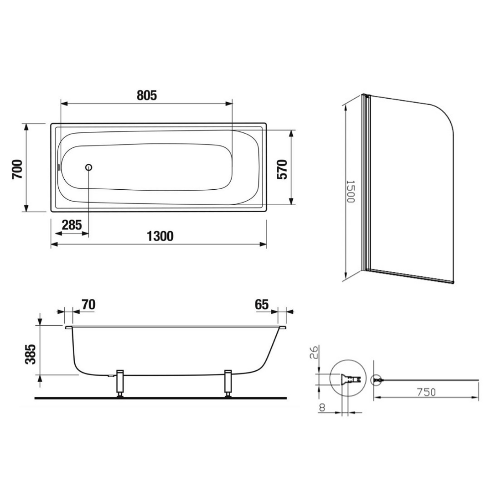 Contenu de l'ensemble baignoire Riga universelle 130x70 cm + Pare baignoire pivotant chrome + pieds (3403-SETP):