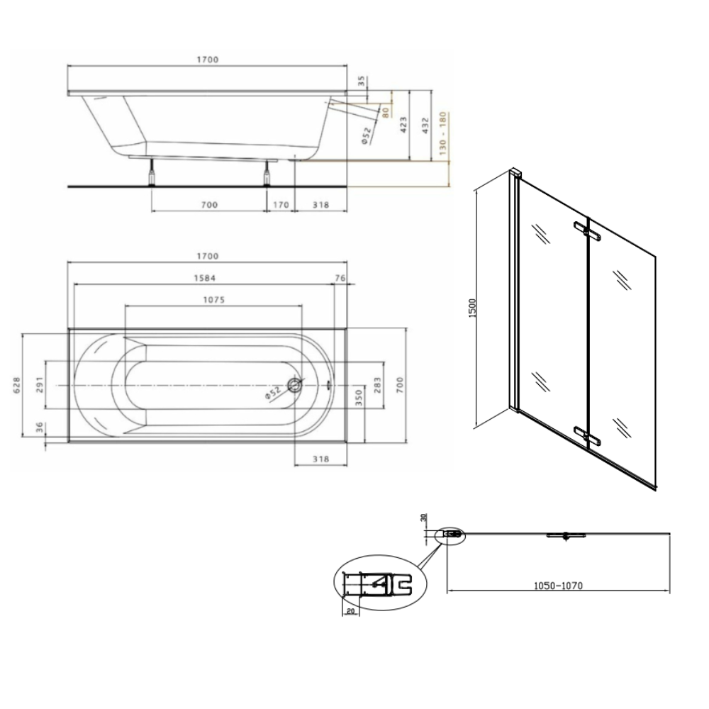 Contenu de l'ensemble baignoire 170x70 cm Opal Plus universelle + Pare baignoire pivotant chrome + pieds (XWP1270000-SETP):