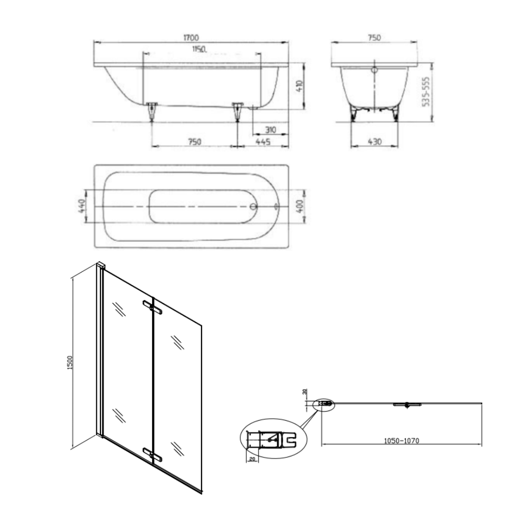 Contenu de l'ensemble baignoire 170x75 cm Saniform universelle + Pare baignoire pliable, 2 volets chrome + pieds (KW3731-SETP2):