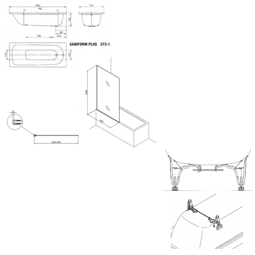 Contenu de l'ensemble baignoire 170x75 cm Saniform universelle + Pare baignoire fixe chrome + pieds (KW3731-SETP3):