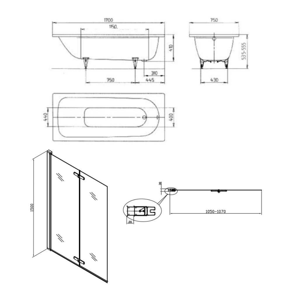 Contenu de l'ensemble baignoire 170x75 cm Saniform universelle + Pare baignoire pliable, 2 volets noir + pieds (KW3731-SETP4):