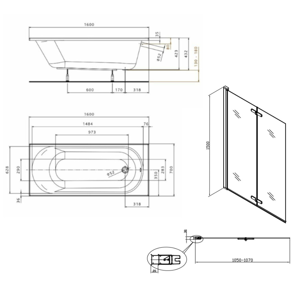 Contenu de l'ensemble baignoire 160x70 cm Opal Plus universelle +Pare baignoire pliable, 2 volets chrome + pieds (XWP1260000-SETP2):