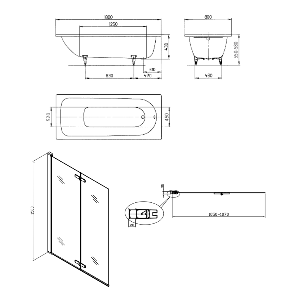 Contenu de l'ensemble 180x80 cm Ensemble baignoire Saniform universelle + Pare baignoire pliable, 2 volets chrome + pieds (KW3751-SETP2):