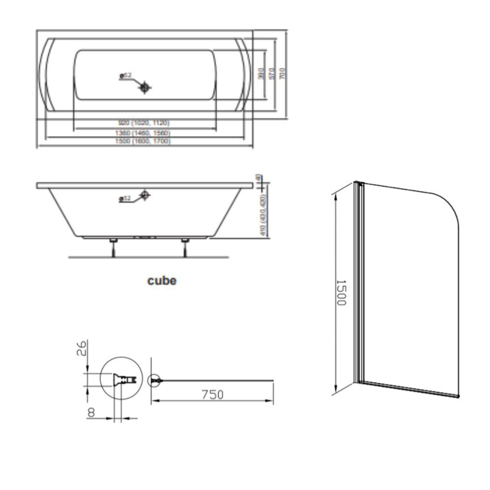 160x70 cm Ensemble baignoire universelle + Pare baignoire pivotant chrome + pieds (CUB1600PLUS-SETP1)