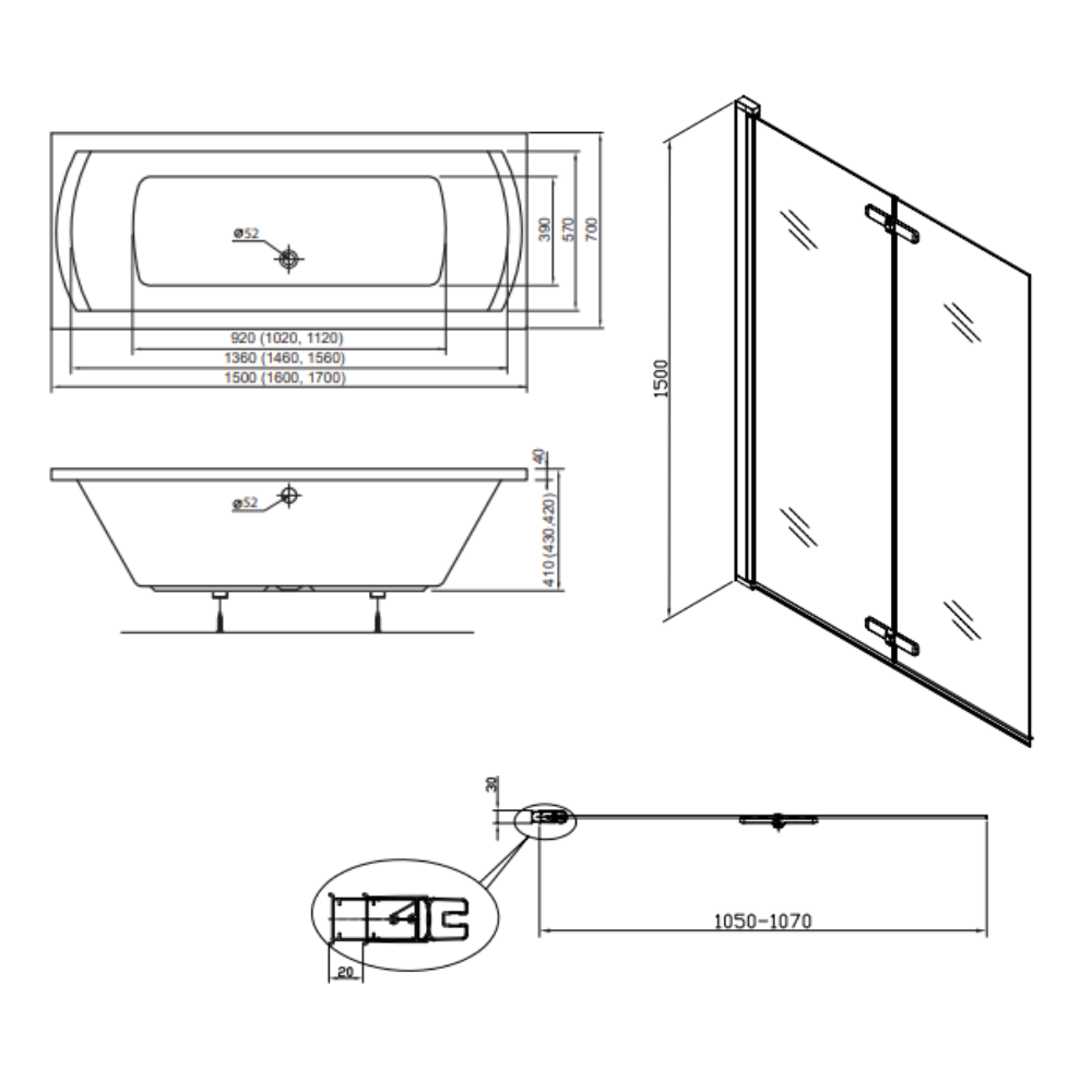 - Possibilité de placer le pare-baignoire à gauche, ou à droite