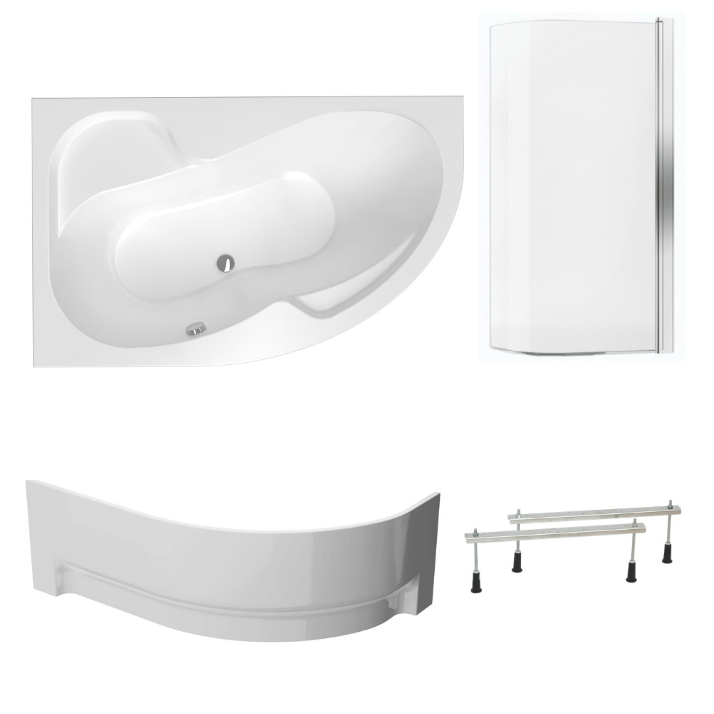Caractéristiques de la baignoire asymétrique en acrylique, 150x100 cm, gauche + tablier 150 cm + pare-baignoire + pieds, Siko Laguna Fortuna Plus, blanc (FO1500LPLUS-SETP1) :