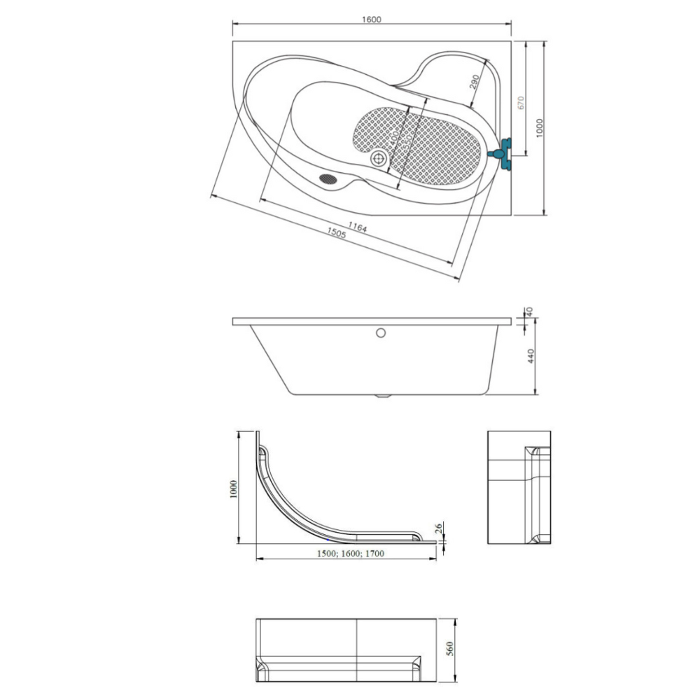 Caractéristiques de la baignoire asymétrique en acrylique, 160x100 cm, droite + tablier 160 cm + pieds, Laguna Fortuna Plus, blanc (FO1600PPLUS-SET1) :