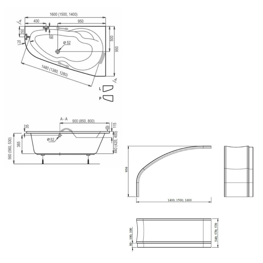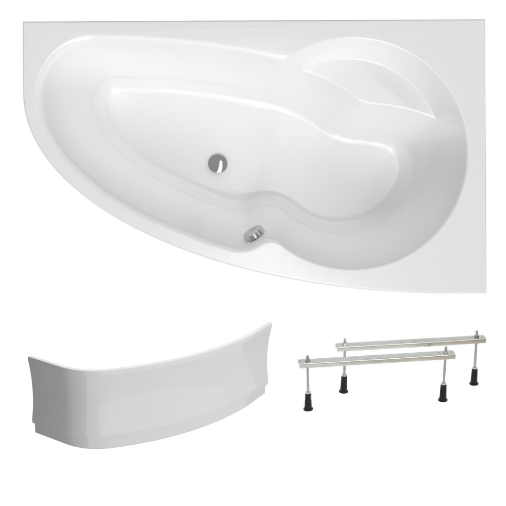 Caractéristiques de la baignoire asymétrique en acrylique, 150x95 cm, droite + tablier 150 cm + pieds, Siko Laguna Luiza, blanc (LU1500P-SET1) :