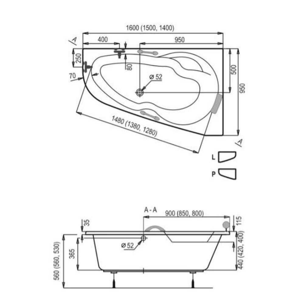 Siko 140x95 cm Laguna Luiza baignoire d'angle gain de place, avec pieds, acrylique, droite, blanc (LU1400P-SET)