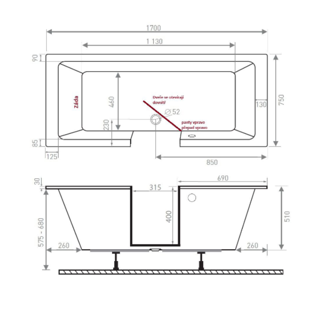 Caractéristiques de la baignoire PMR 170x75 cm avec porte ouverture à gauche, 228L, blanc (SATVD170P):