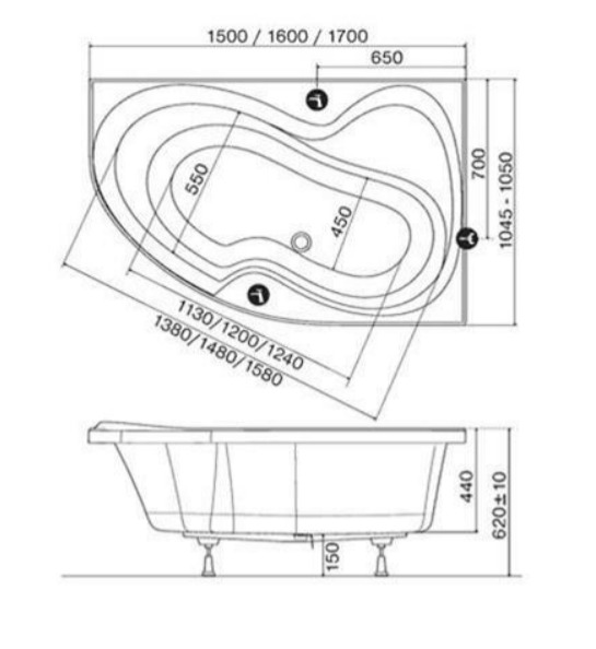 Caractéristiques de la Baignoire asymétrique 160 x 105 cm orientation droite, Acrylique, Blanc, Ravak Rosa II (CL21000000) :