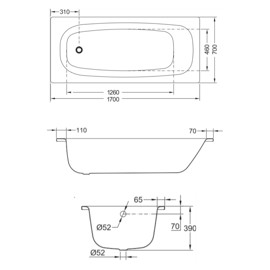 Jika (Groupe Roca) Tanza 170 x 70 x 39 cm Baignoire droite en acier émaillé, sans pieds, blanc (H2251810000001)