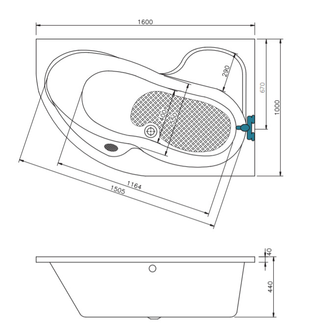Caractéristiques de la Baignoire asymétrique, 160x100cm, orientation droite, en acrylique, Blanc, Siko Laguna Fortuna (FO1600PPLUS) :