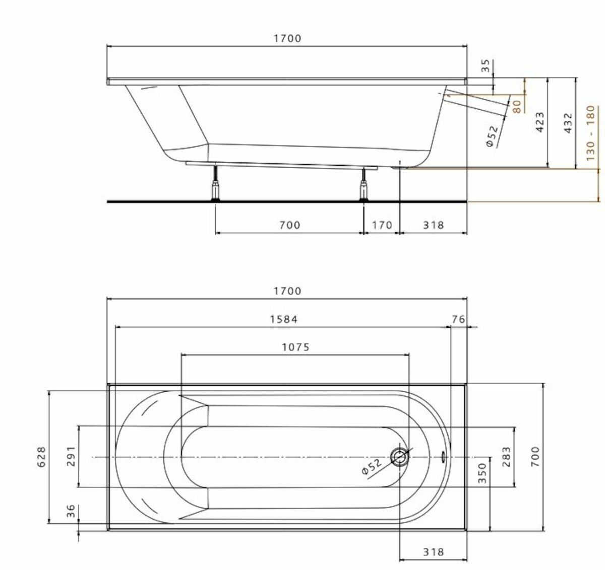 Opal Plus 170 x 70 cm Baignoire droite avec pieds 190 L en acrylique, blanc (XWP1270000)