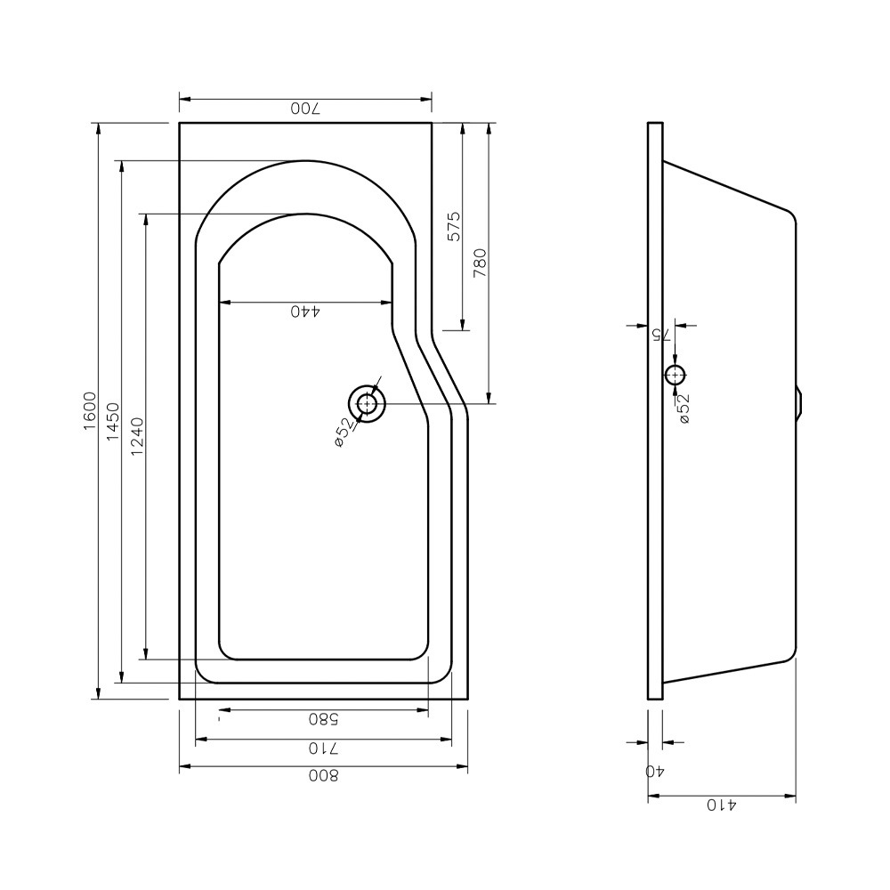 160x80 cm Beata Plus baignoire bain douche asymétrique acrylique positionnement gauche, sans pieds, blanc (BE1600LPLUS)