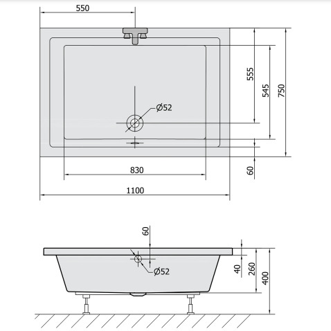 Caractéristiques de la baignoire rectangulaire en acrylique 110x75x26cm, sans pieds, Polysan Deep, blanc (72883):