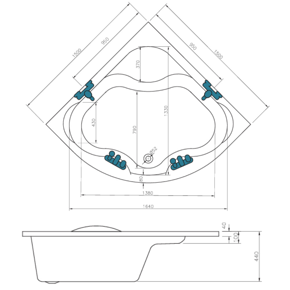 Caractéristiques de Laguna Syntia Plus Baignoire d'angle, 150x150 cm acrylique, gauche et droite, Blanc (SY1500PLUS) :