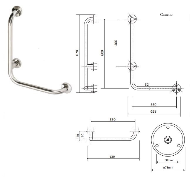 Caractéristiques de la Barre de maintien fixe 60x65cm en forme de L, Pose à gauche, Acier inoxydable, Bemeta HELP (301112071)  :