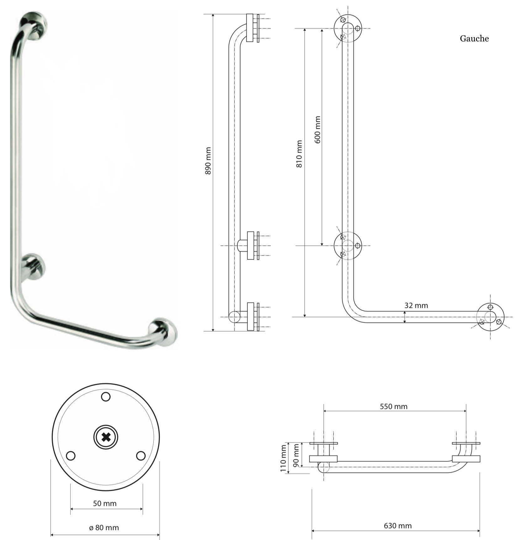Caractéristiques de la Barre de maintien fixe 80x60cm en forme de L, Pose à gauche, Acier inoxydable brossé, Bemeta HELP (301112042) :
