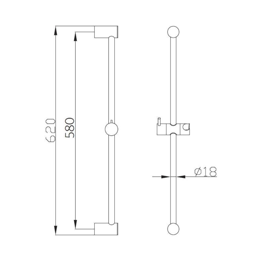 Barre de douche en finition chrome, longueur 620 mm. Simple, fonctionnelle et compatible avec la majorité des douchettes.