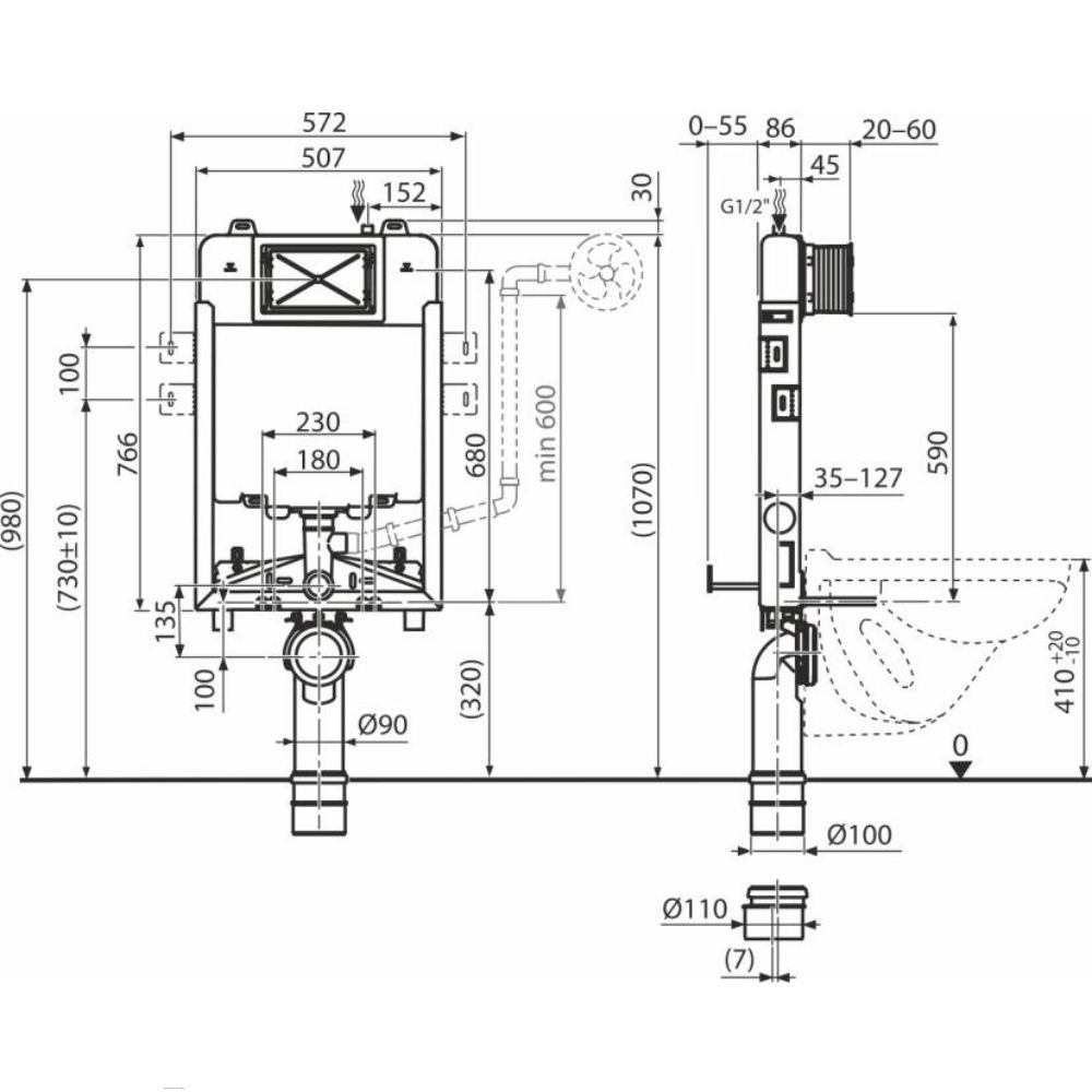 - Compatible avec les WC suspendus avec entraxe de fixation de 180 mm ou 230 mm
