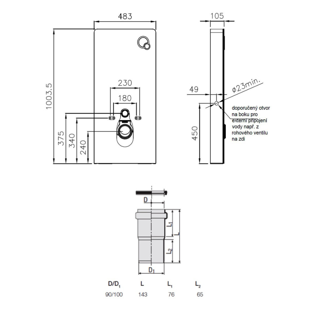 - Fournis avec pipe d'évacuation en PEHD (noire) diamètre 90 mm (Type Geberit / Grohe ) vers un réseau PVC (gris) en diamètre 100 mm (Standard Français)