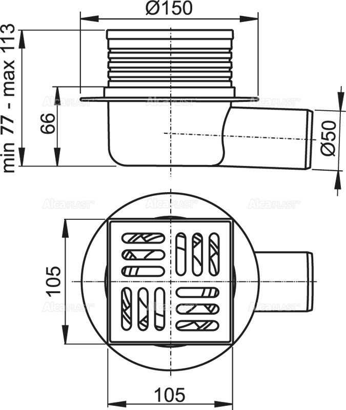Alca Plast Siphon de sol sortie horizontale 105 x 105/50 MM (APV26)
