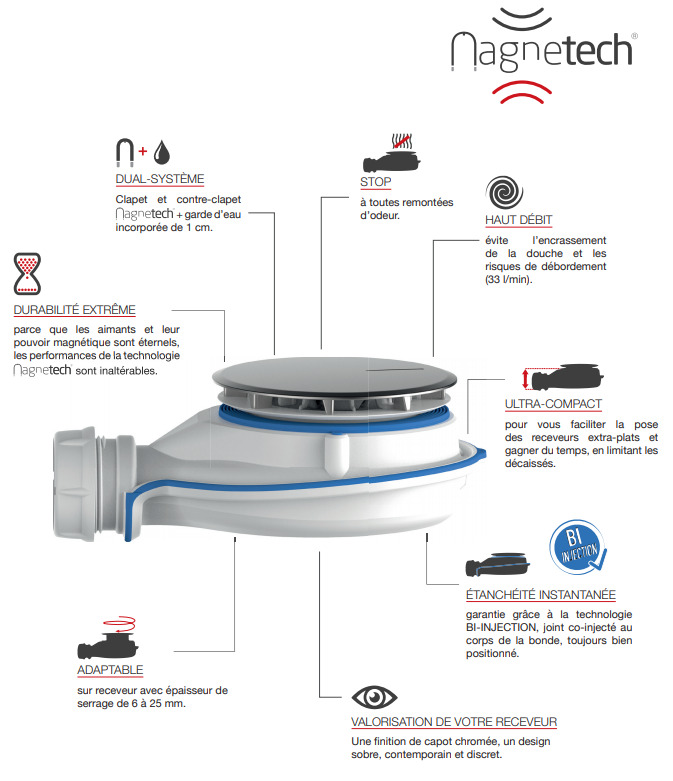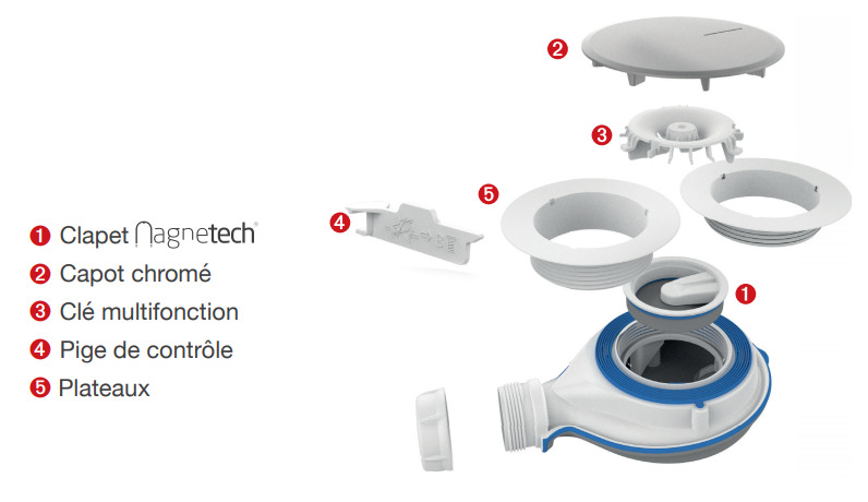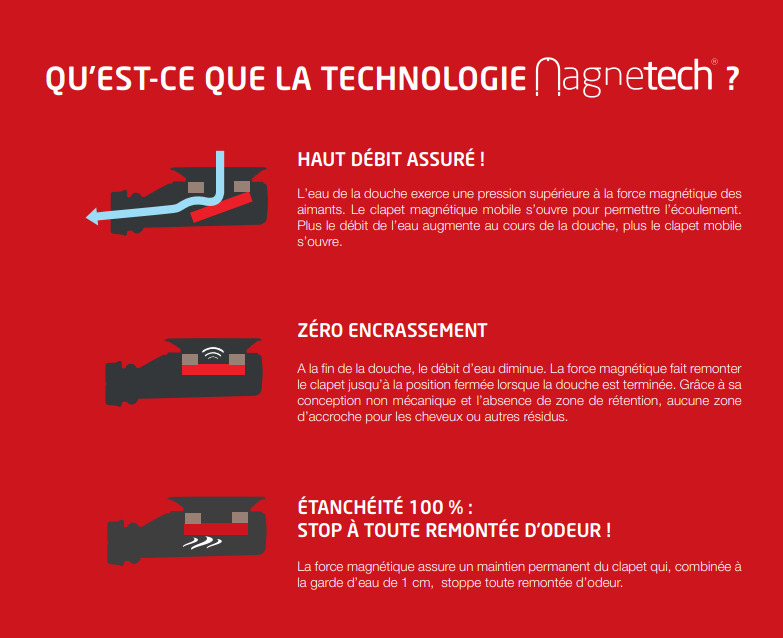 La force magnétique assure un maintien permanent du clapet qui, combinée à la garde d’eau de 1 cm, stoppe toute remontée d’odeur.