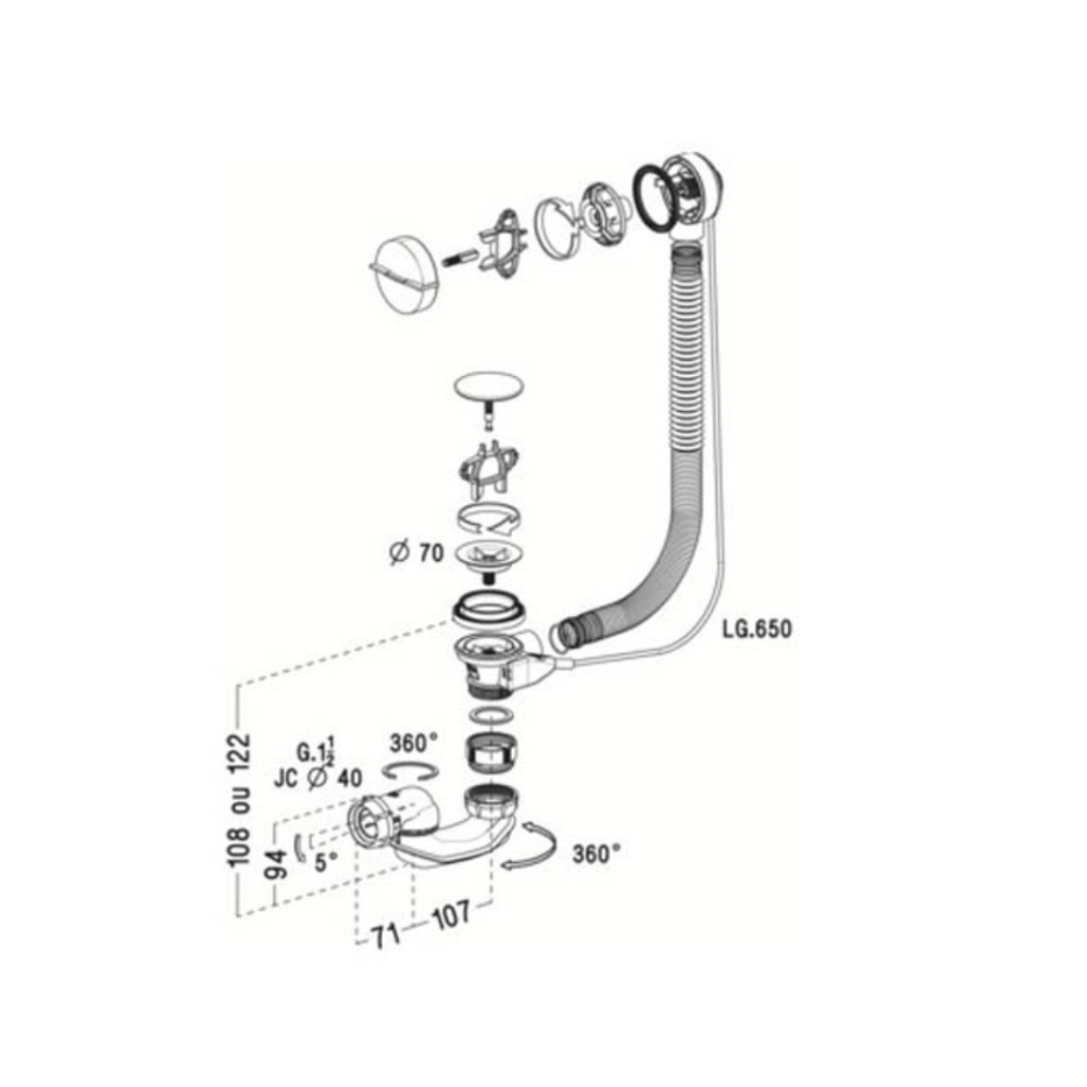 Caractéristiques du Vidage baignoire avec câble 65cm, Débit de 70l/min, Rotule orientable à 360°, pour perçage Ø52mm, Nicoll Easybain (0203611) :