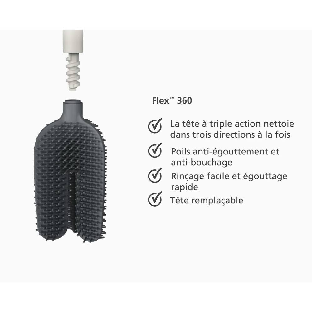 Nettoyer les toilettes n'a jamais été aussi facile. La tête triple-action de la brosse Flex™ 360 opère dans trois directions simultanément pour un nettoyage des toilettes plus facile et plus hygiénique. De plus, le support de rangement élégant avec finition mate s'intègre harmonieusement dans n'importe quelle salle de bain.