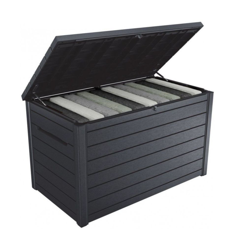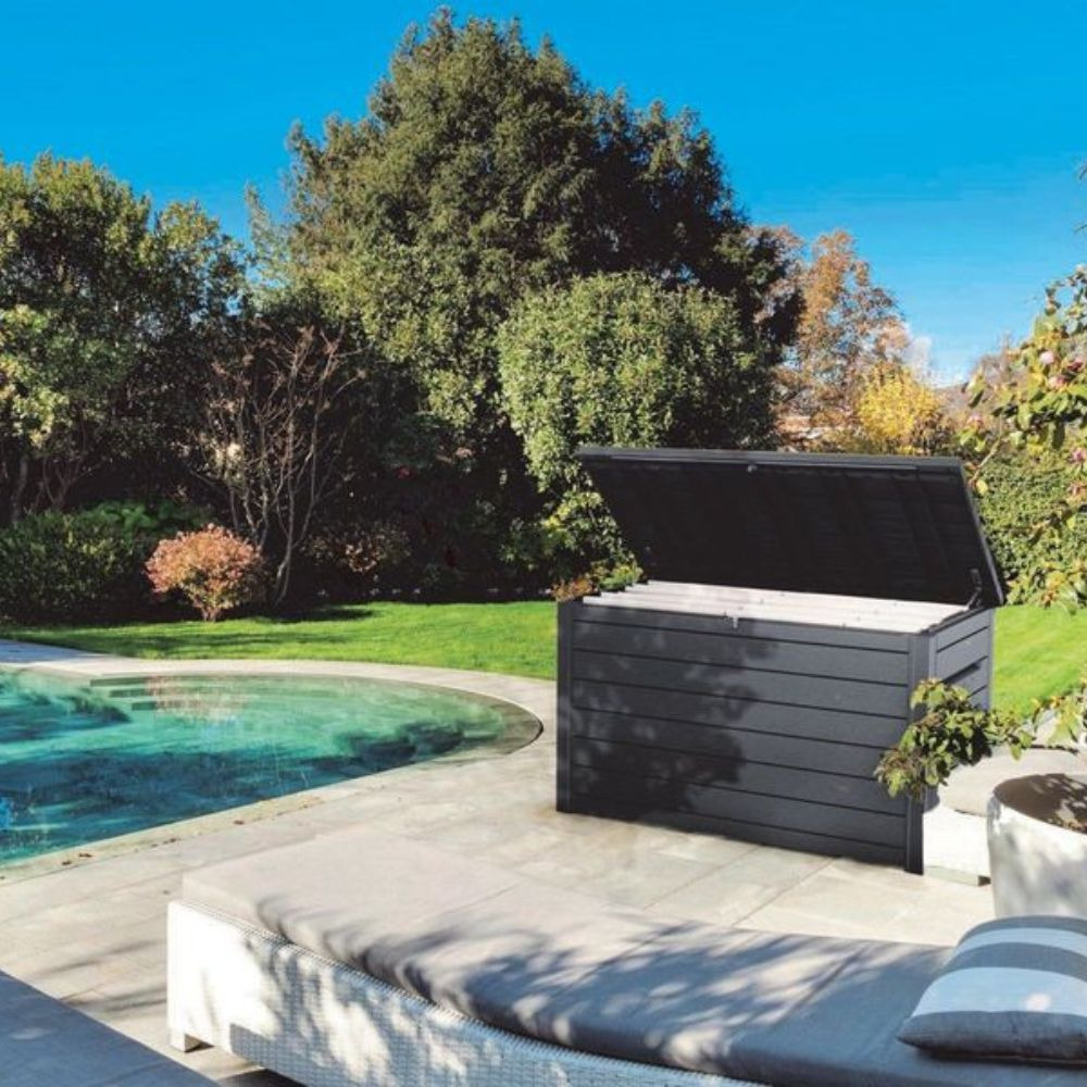 - Conçue avec une très grande capacité intérieure de 850 l pouvant contenir de nombreux objets, allant des grands coussins aux outils de jardinage en passant par les accessoires de piscine