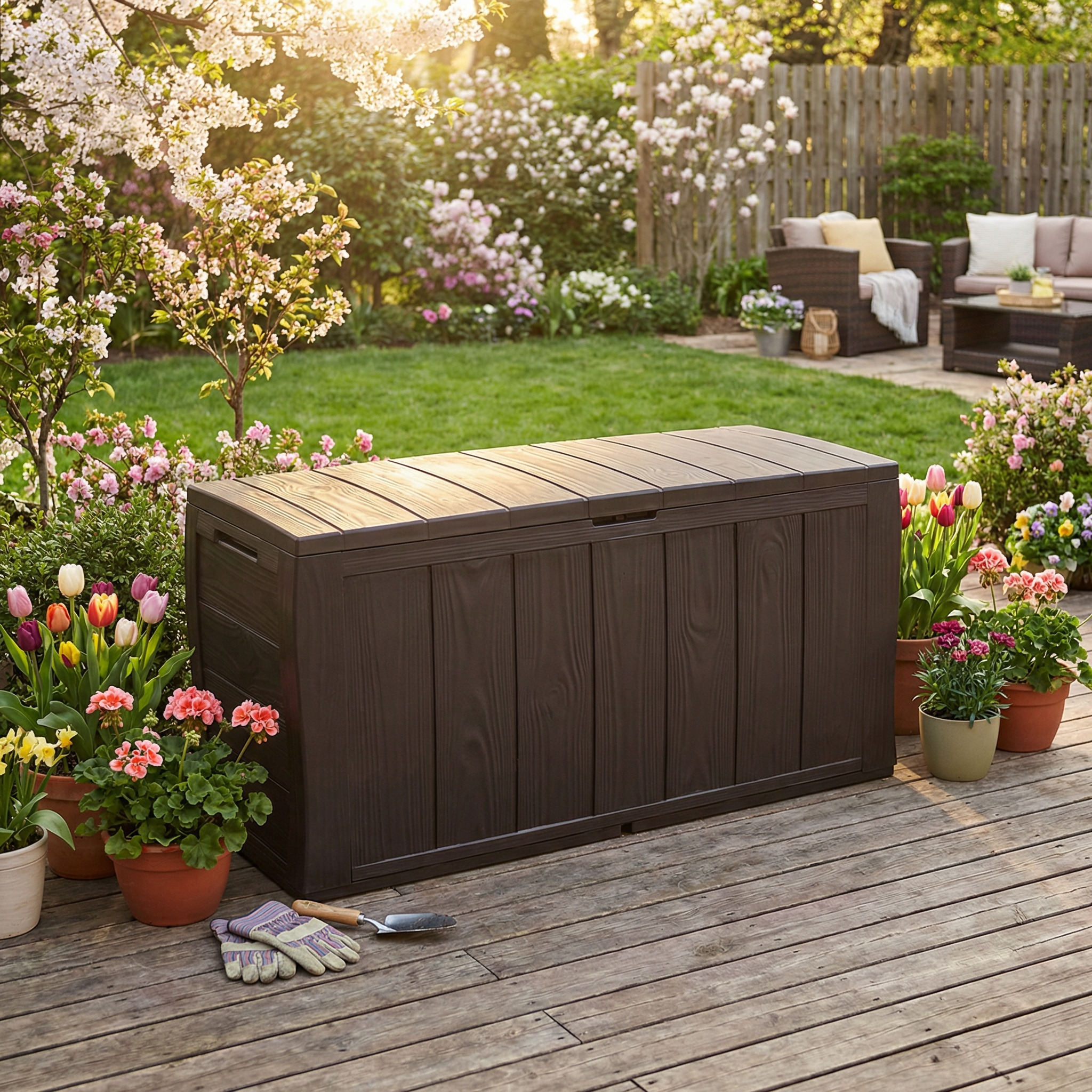 Sa structure en résine résistante aux intempéries protège efficacement le contenu contre la pluie, l’humidité et la poussière. Il ne rouille pas, ne pourrit pas et conserve son aspect dans le temps. Sa finition aspect bois décoratif s’intègre facilement avec tout mobilier de jardin.