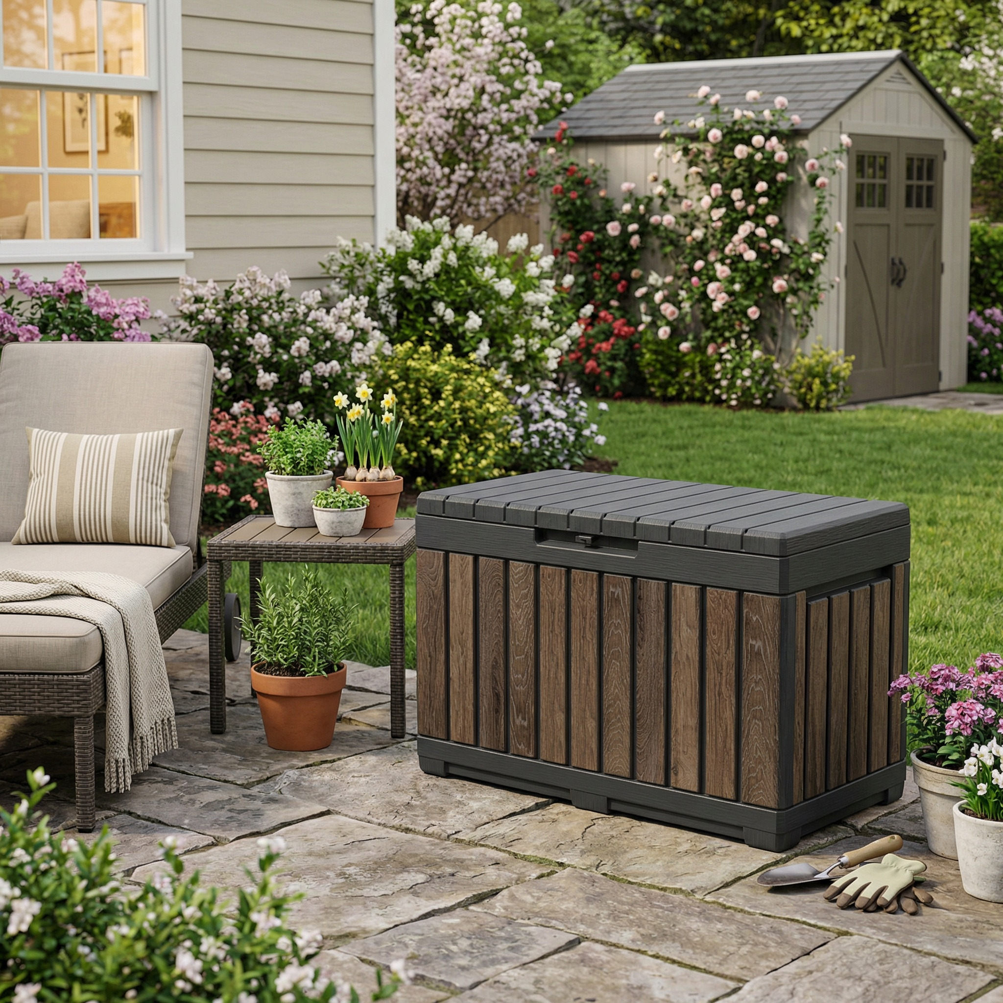 - Rangement d'outils de jardin, coussins, accessoires de barbecue ou jouets