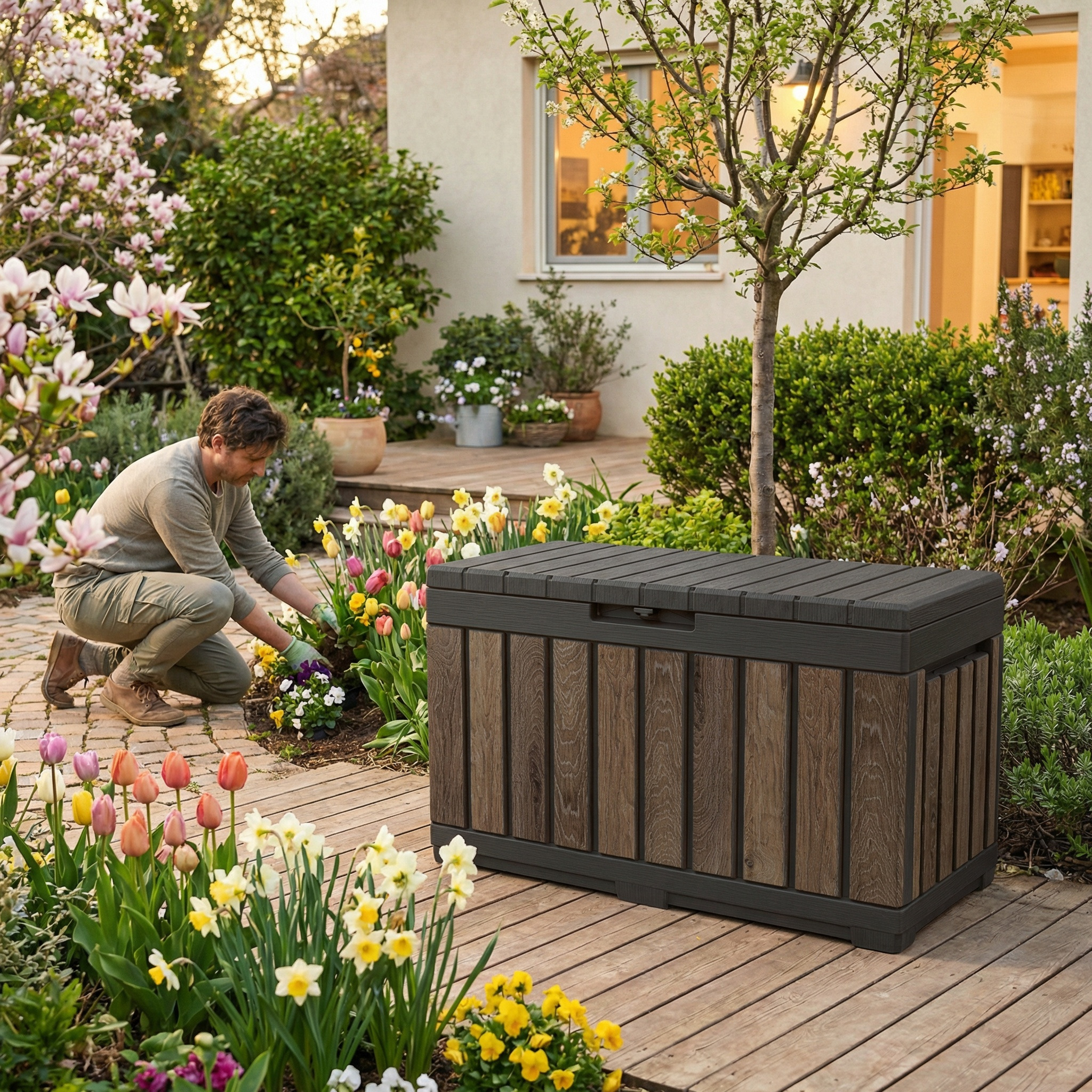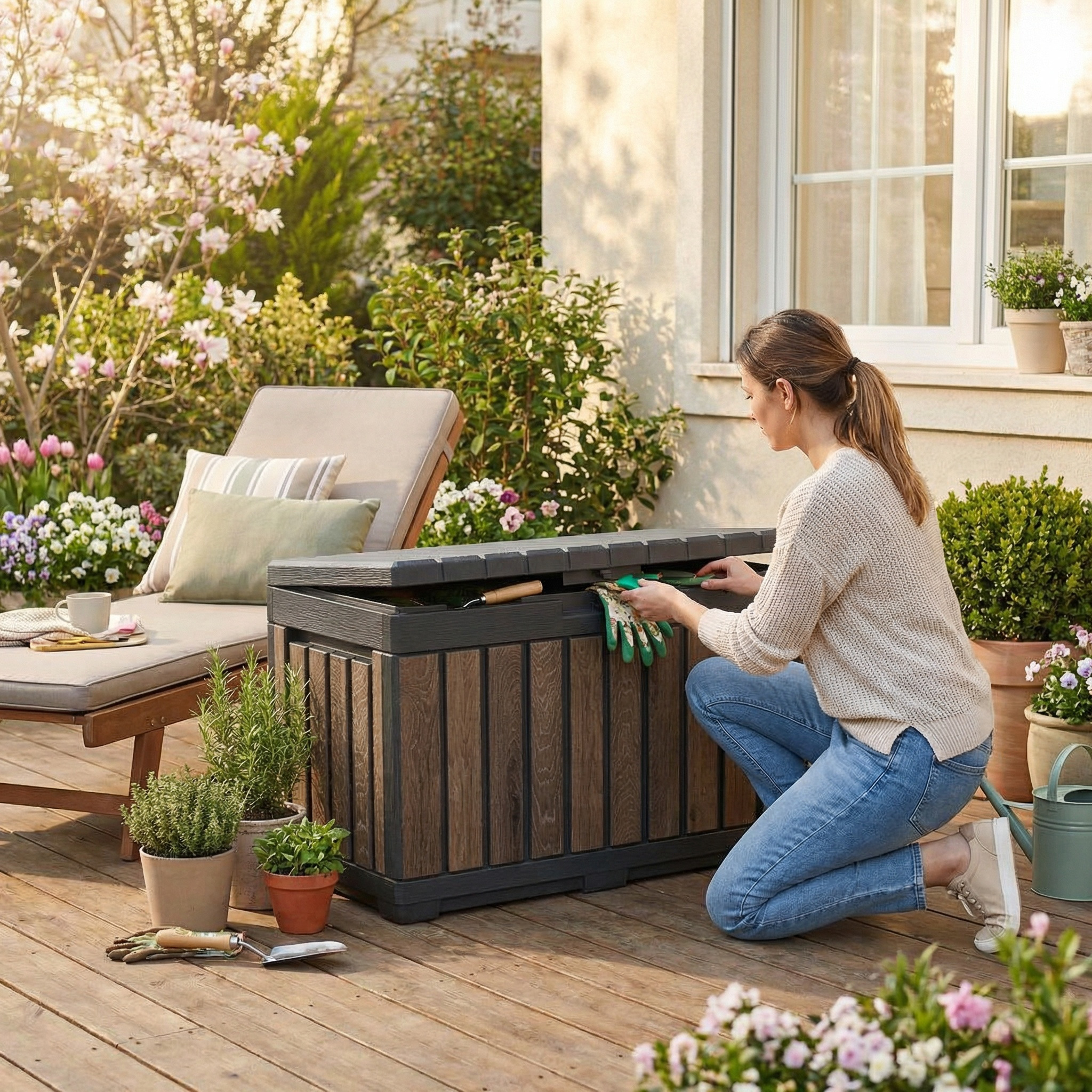 Fabriqué en plastique haute résistance avec finition effet bois naturel, ce coffre de jardin ne rouille pas, ne pourrit pas et ne nécessite aucun entretien. Sa structure robuste résiste aux intempéries et aux UV, tout en gardant un aspect esthétique qui s’intègre facilement dans tous les styles de jardin ou de terrasse.