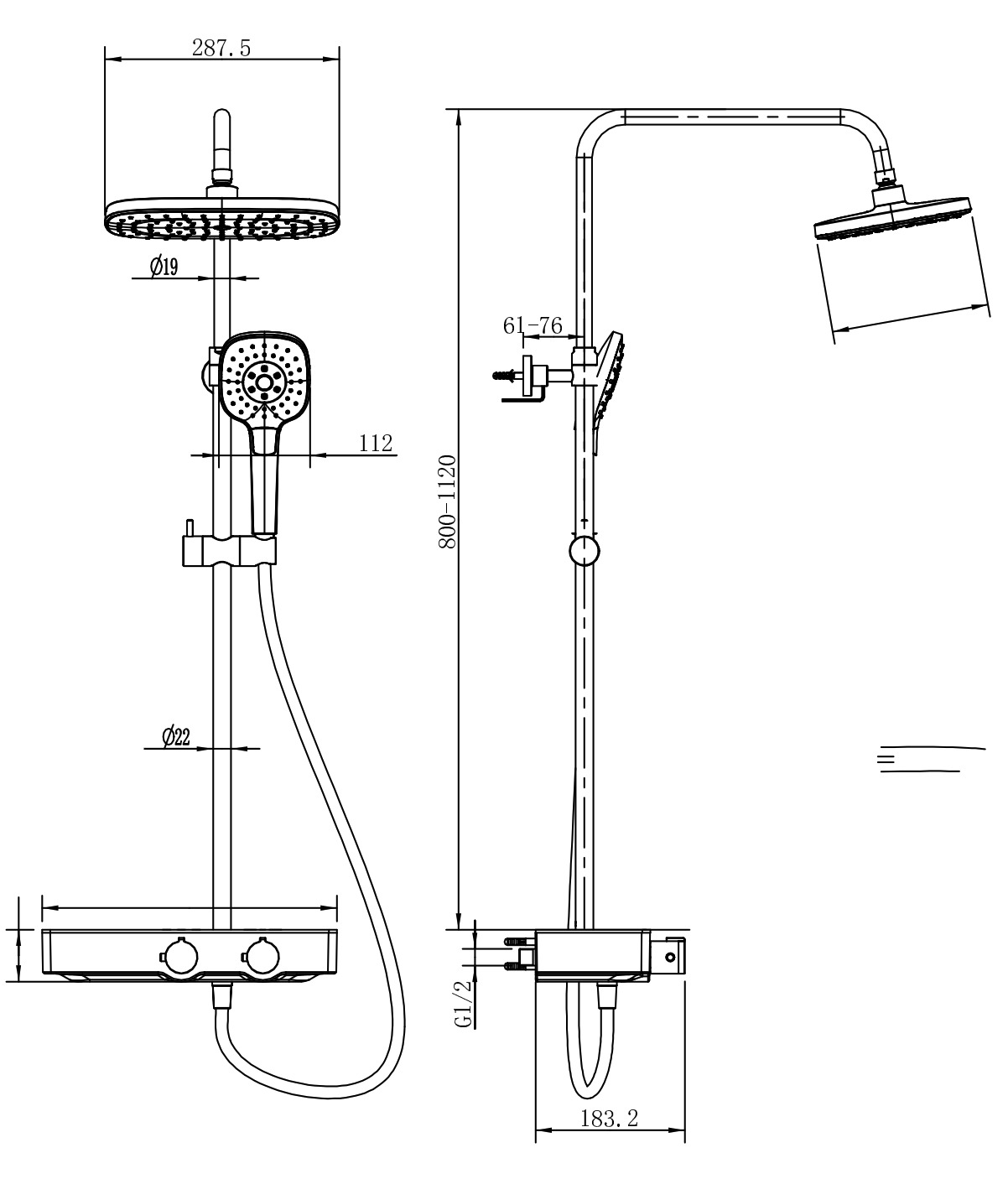 - Hauteur de la colonne de douche réglable de 80 à 112 cm