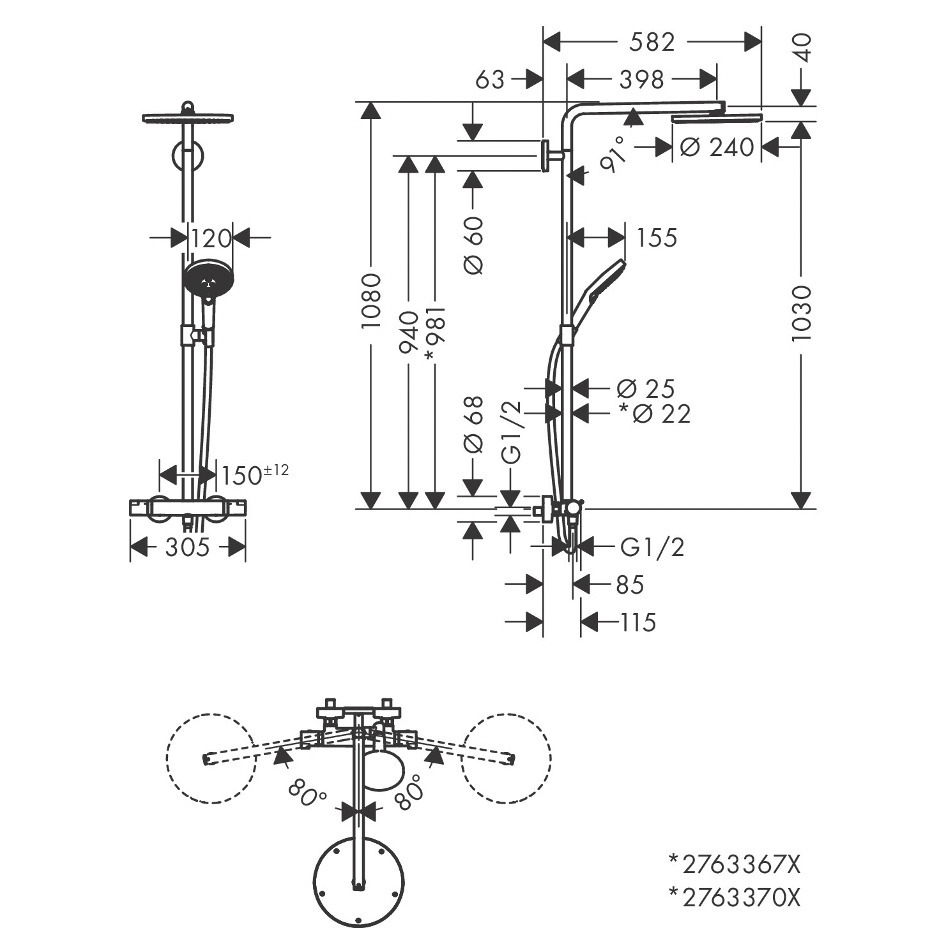 Caractéristiques de la colonne de douche 240 1 jet PowderRain avec mitigeur, Aspect Doré poli Hansgrohe Raindance Select S (27633990) :