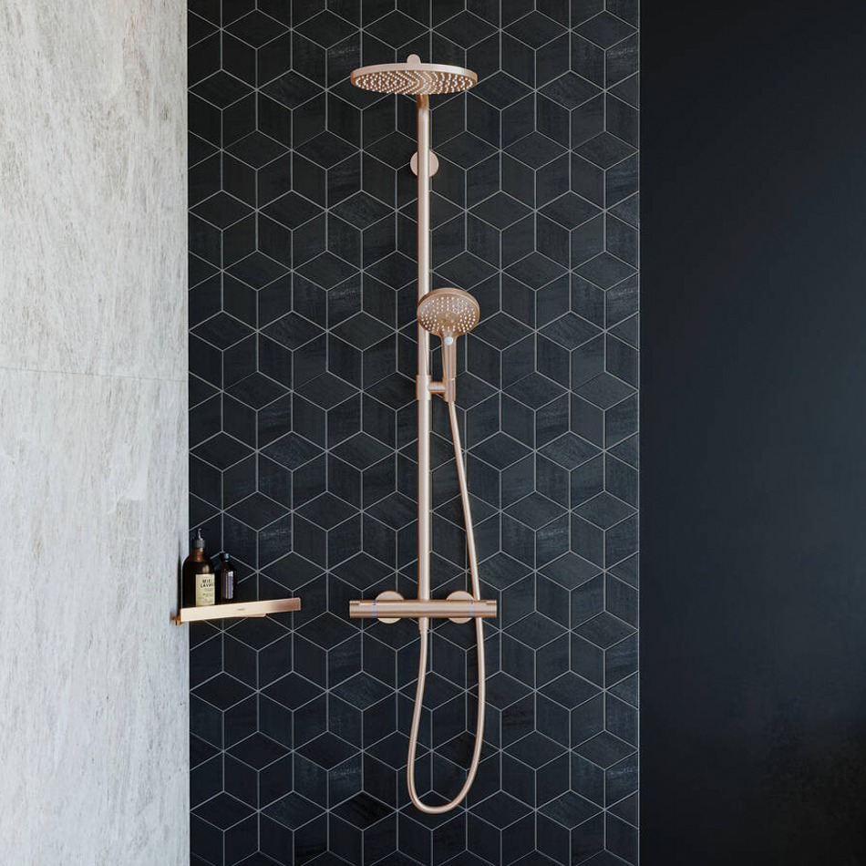 - Comprenant : douche de tête, douchette, thermostatique de douche, flexible de douche, curseur, barre de douche