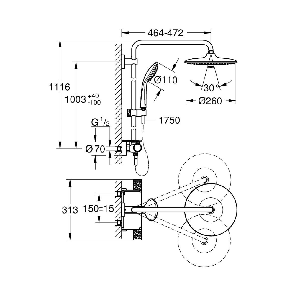 Caractéristiques de la colonne de douche avec mitigeur thermostatique, Chrome Grohe Vitalio System 260 (26403002) :