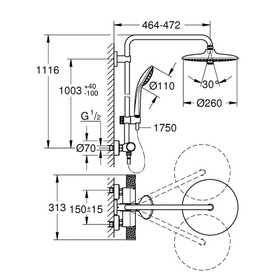 Caractéristiques de la EUPHORIA SYSTEM 260 colonne de douche thermostatique XL, Chrome, (27296003):
