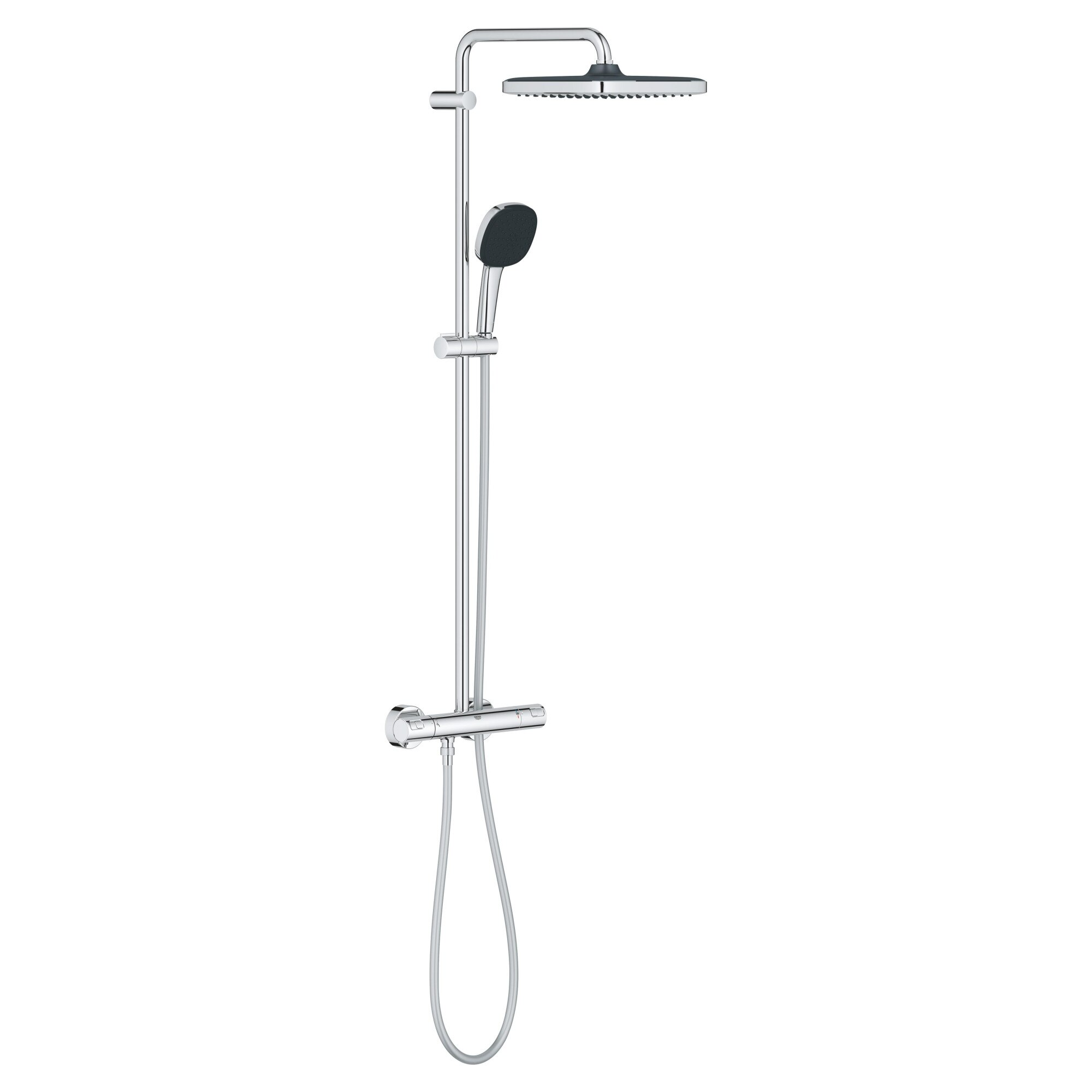 GROHE QUICKFIX - Colonne thermostatique 1 jet - 25x25 cm + douchette 2 jets CUBE - Bras de douche de 390 mm orientable horizontalement Fixation supérieure réglable en hauteur pour ajustement sur des trous existants - Mitigeur thermostatique incluant fonction inverseur 2 sorties Permet le changement entre la douche de tête et la douchette à main - Douche de tête -Comfort Ø25 cm - 1 Jet : Pluie avec Procédé anti-calcaire SpeedClean Avec rotule / Angle de rotation ± 10° GROHE EcoJoy débit limité inférieur à 9.5 l/min - Douchette à main -Start 10 cm - 2 jets : Pluie , Jet GROHE EcoJoy Limiteur de débit 5.7 l/min avec Procédé anti-calcaire SpeedClean ShockProof anneau en silicone anti choc Curseur ajustable en hauteur et orientable Flexible de douche VitalioFlex Comfort 1750 mm Lisse pour facilité le nettoyage avec système anti-torsion Convient pour chauffe-eau instantané à partir de 18 kW/h Débit minimum nécessaire 7 l/min. Pression minimale 1 bar GROHE EcoJoy économie d’eau GROHE TurboStat Régulation de la température quasi-instantanée et sécurité anti-brulûres en cas de coupure d'eau froide GROHE SafeStop butée à 38°C GROHE SafeStop Plus limiteur de température à 43°C (livré non monté) GROHE DreamSpray jet parfaitement uniforme GROHE StarLight Chrome éclatant et durable Design & engineering made in Germany Design & conception réalisés en Allemagne